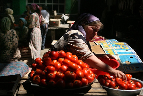 Узбекская женщина продаёт домашние помидоры на местном продуктовом рынке в Маргилане. (Фото: Uriel Sinai/Getty Images)