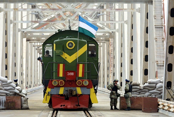 Узбекские солдаты охраняют поезд, перевозящий продуктовую помощь из Узбекистана и ООН в Афганистан, декабрь 2001 года. (Фото: Олег Никишин/Getty Images)