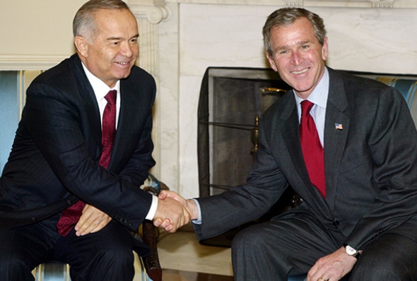 Джордж Буш-младший жмёт руку Исламу Каримову 12 марта 2002 года на встрече в Белом доме. (Фото: Alex Wong/Getty Images)