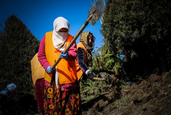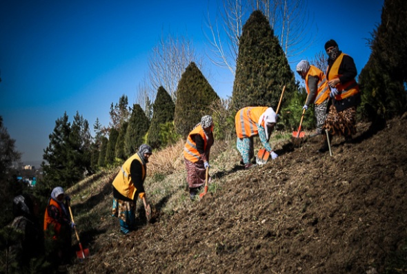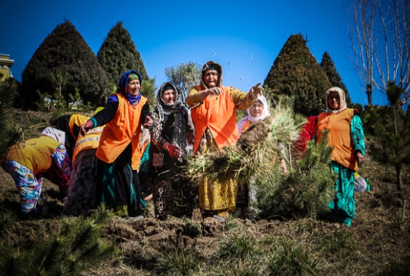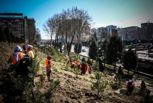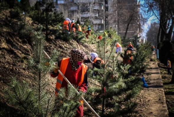 Женщины сажают ели в Душанбе. (Фото Лидии Исамовой)