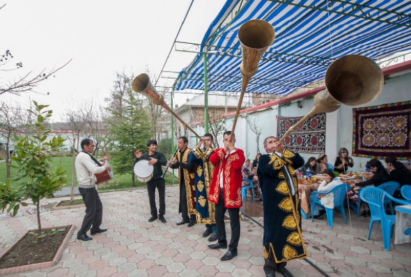 Музыканты играют на карнаях – длинных духовых инструментах, достигающих в в длину до двух метров. (Фото Бахриддина Исамутдинова)