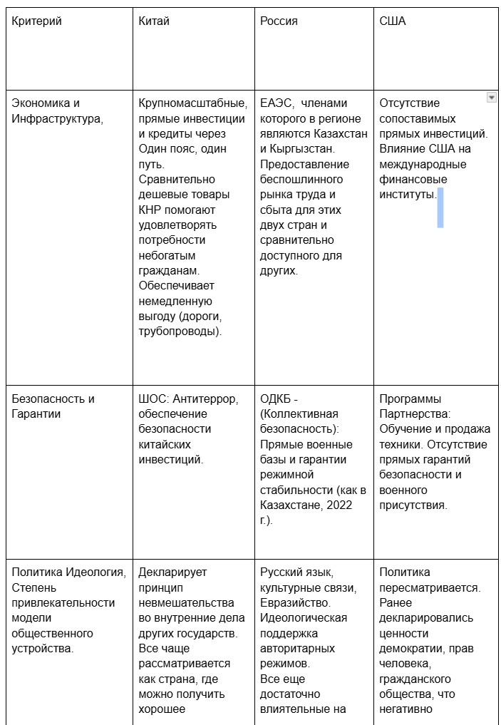 Конкуренция США с другими влиятельными игроками происходят в в трех сферах; экономика и инфраструктура; безопасность и гарантии; политика и идеология. В первой сферы главный конкурент Китай, который стал для ЦА в последние годы ключевым торговым партнером, кредитором, и крупнейшим инвестором в инфраструктуру. Другой соперник — Россия, традиционный партнер для правящих элит стран ЦА с налаженными связями на всех уровнях общества.