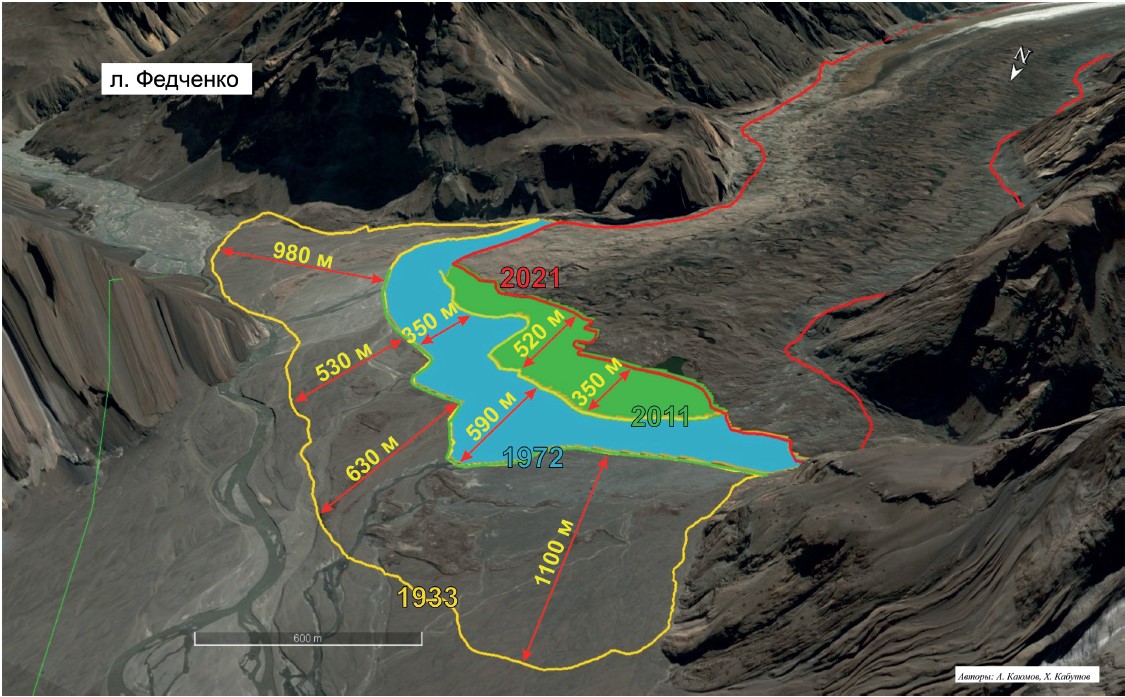 Изменения границ языка ледника Ванджях по годам. Источник: Атлас-Каталог ледников Таджикистана.